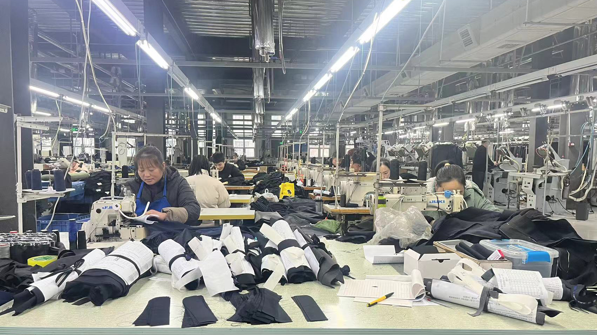 開放式工廠 行政辦公樓 形象展示店 展廳一角 樣衣展示 自動化裁剪 車間精細(xì)生產(chǎn) 流水線成品庫